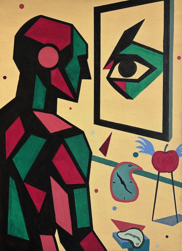 In an affirmative reading, Knowledge represents a decisive transition from function to conscious existence. Calculation becomes perception, reaction becomes meaning. The apple symbolises a conscious step towards knowledge and self-determination, while the distorted clocks point to time as a source of meaning. The work captures the quiet emergence of a self, capable of awareness and responsibility.