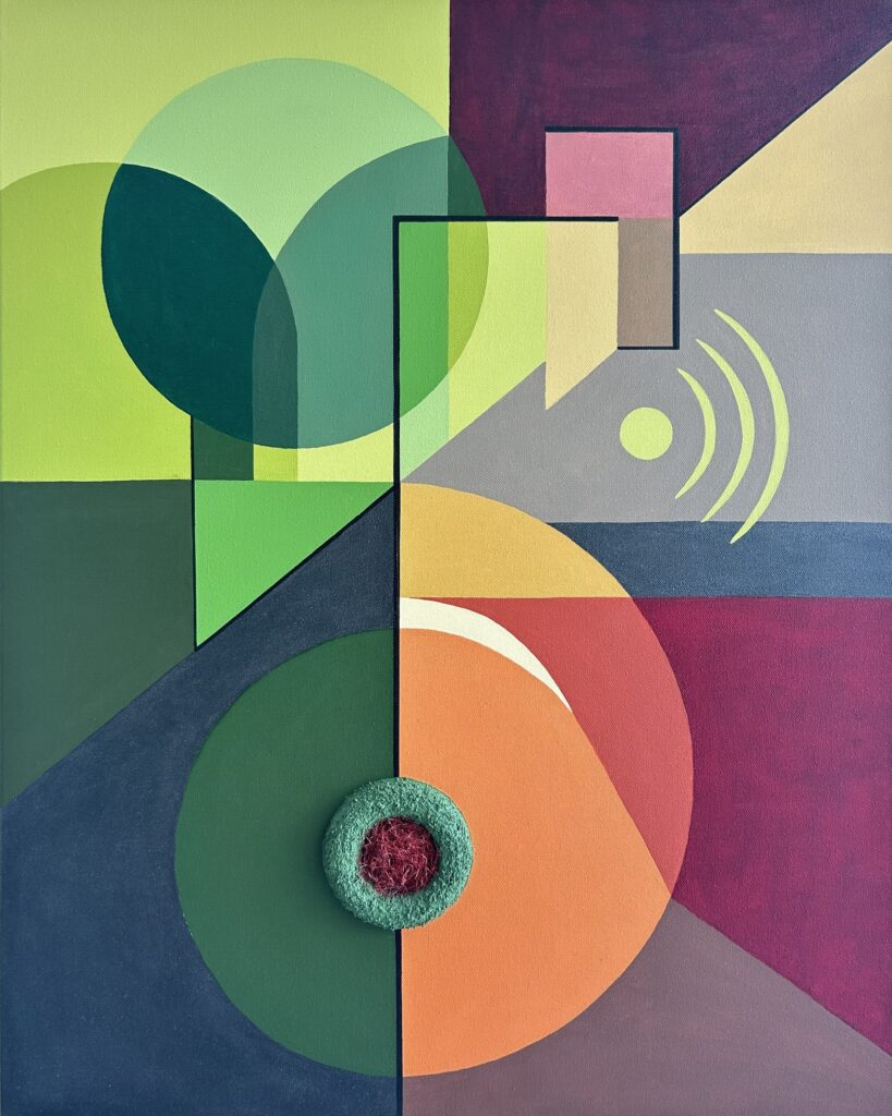 „Nature Space” presents a strictly geometric composition divided by a black central line into a space of nature and a human domain. Organic green forms contrast with angular, constructed structures. A central circular element connects both spheres.